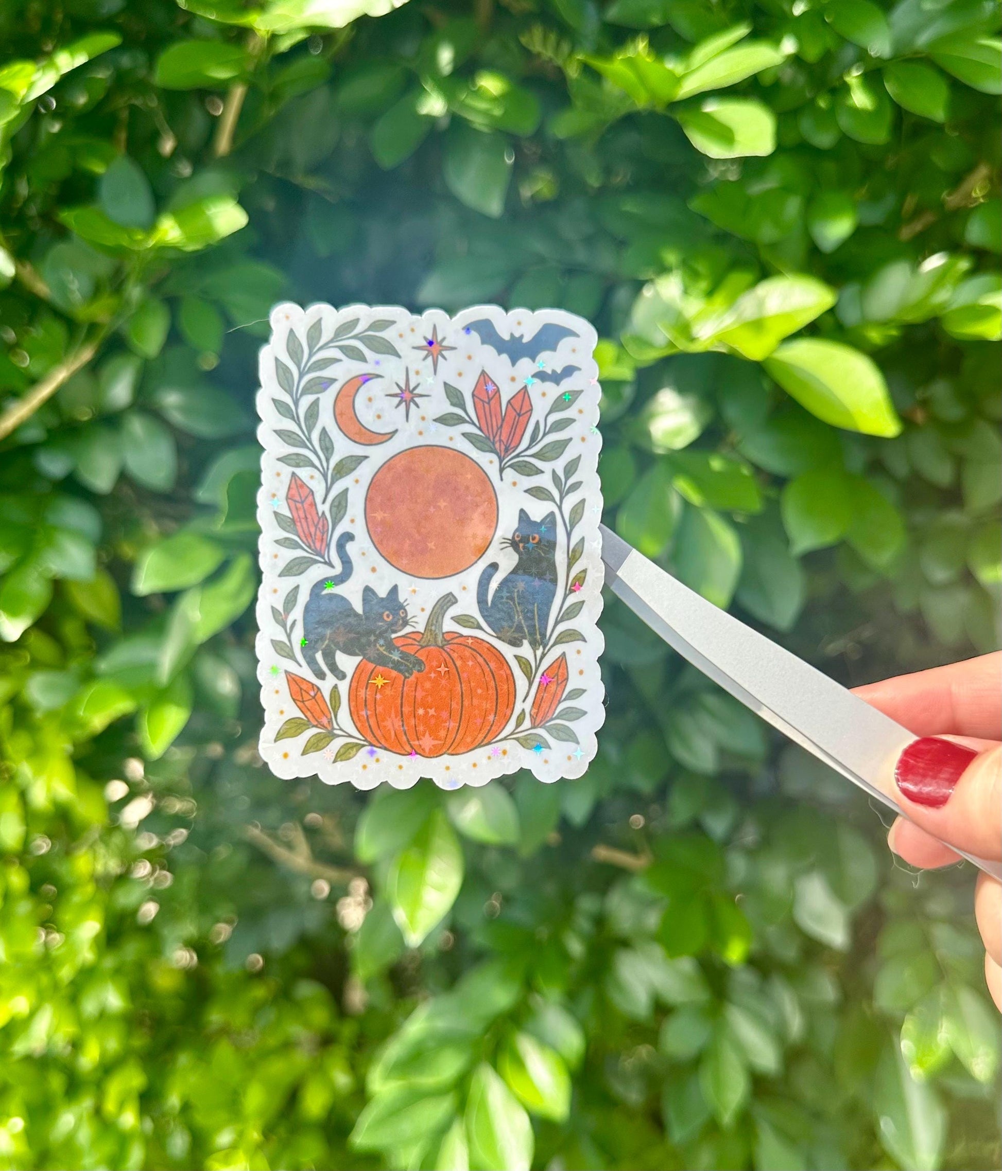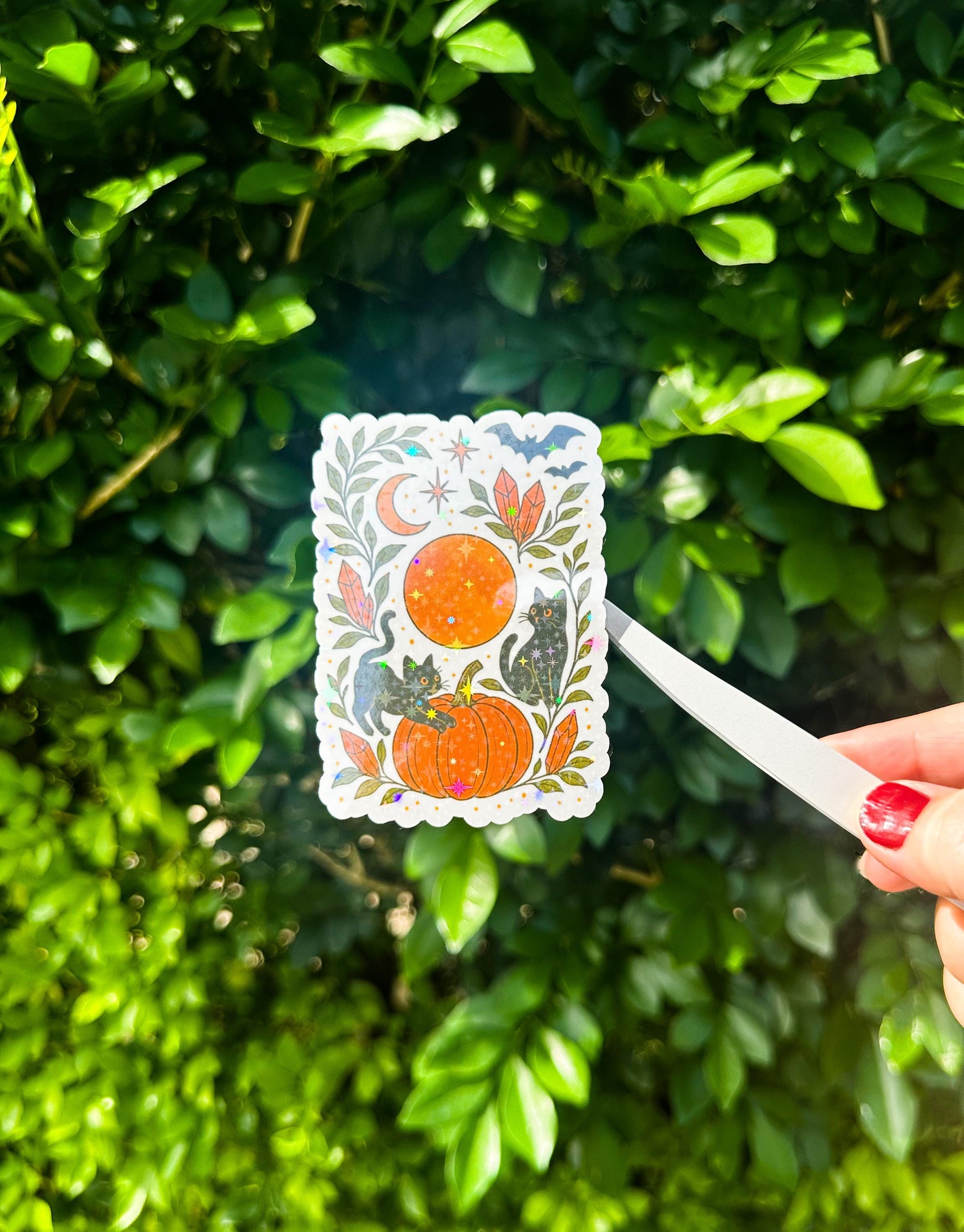Black Cat Pumpkin Sticker – Halloween Autumn Moon Holographic Vinyl Decal, Witchy Fall Spooky Season Sticker - Magical Halloween Cat