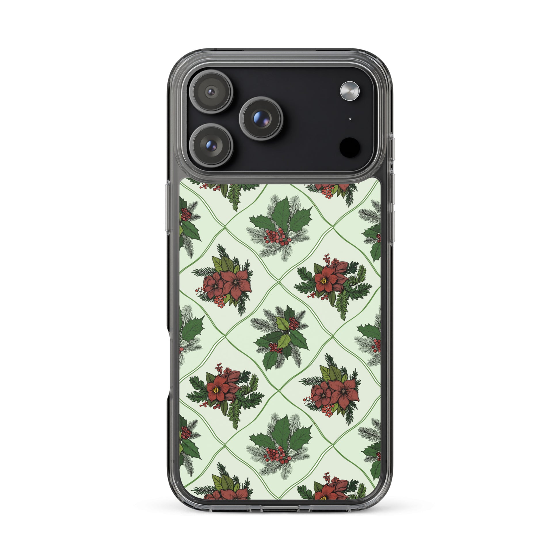 Bring holiday cheer everywhere you go with this festive Christmas floral phone case! Featuring a delicate pattern of poinsettias, holly leaves, and berries on a soft green grid background, this case captures the cozy, nostalgic charm of the season