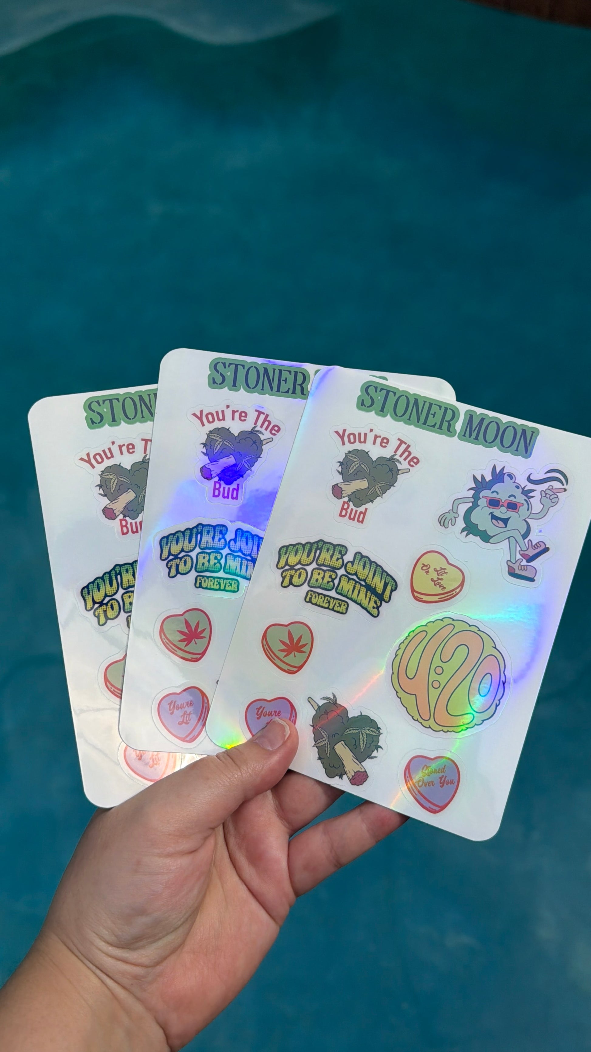 Holographic Valentines Stoner Sticker Sheet, 420 Decal sheets, Funky Waterproof 420 Sticker Sheets, love, Vday Stoner Gifts, Hearts