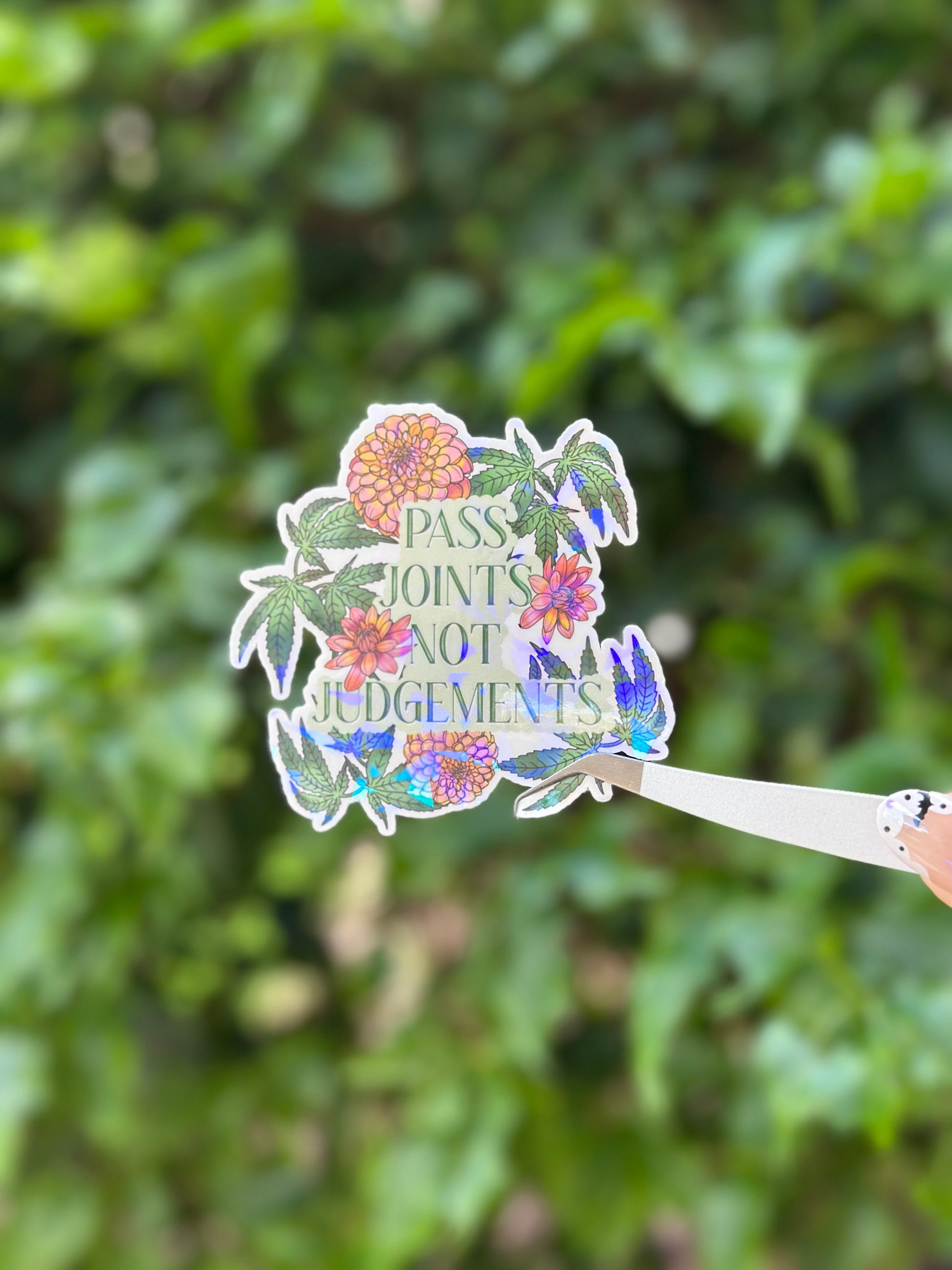 Bring a little sunshine and sparkle to your day with this 3x3 inch holographic vinyl sticker! Featuring bold peach dahlias, shimmering canna plants, and the uplifting phrase “ Pass Joints not Judgements” this durable, waterproof sticker is perfect for laptops, water bottles, journals, or anywhere you want to add positive energy. 🌻✨