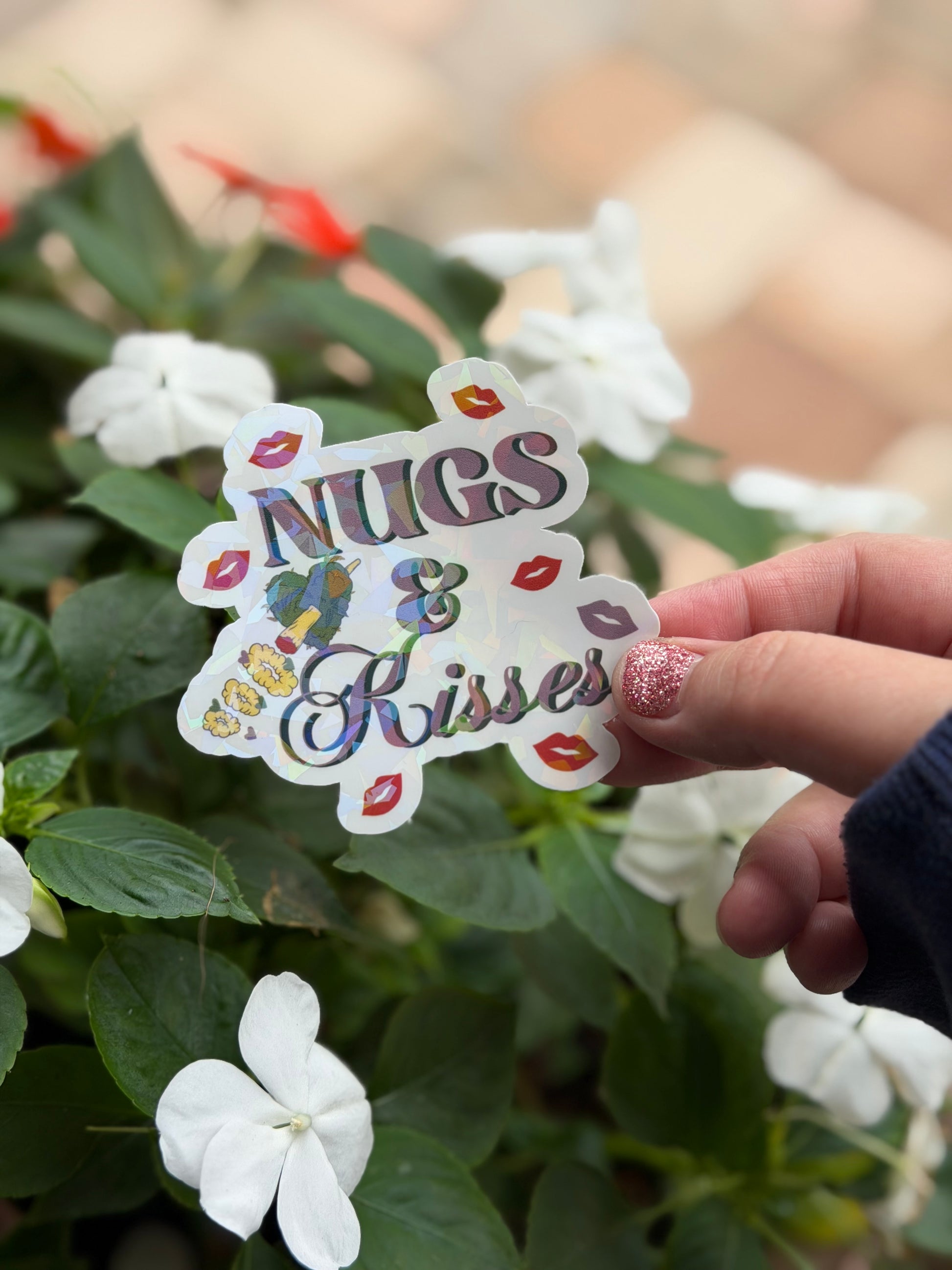 Add some Stoner Valentines humor to your collection with this Nugs & Kisses Decal year long. The Broken Glass holographic laminate makes it sparkle in the light, giving it a magical touch wherever you stick it.